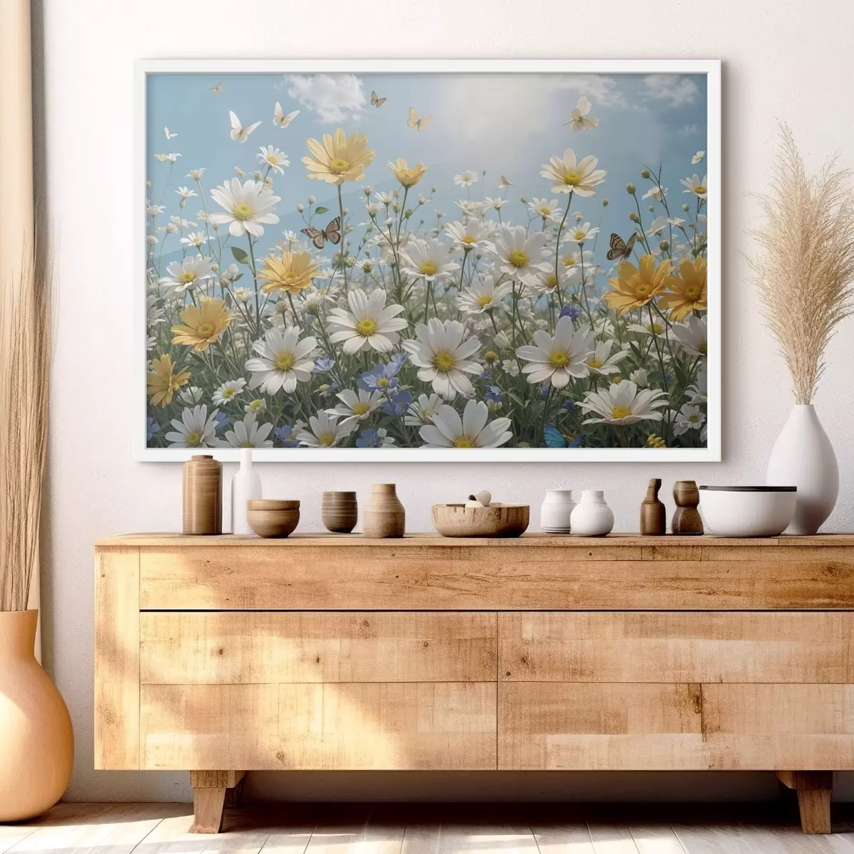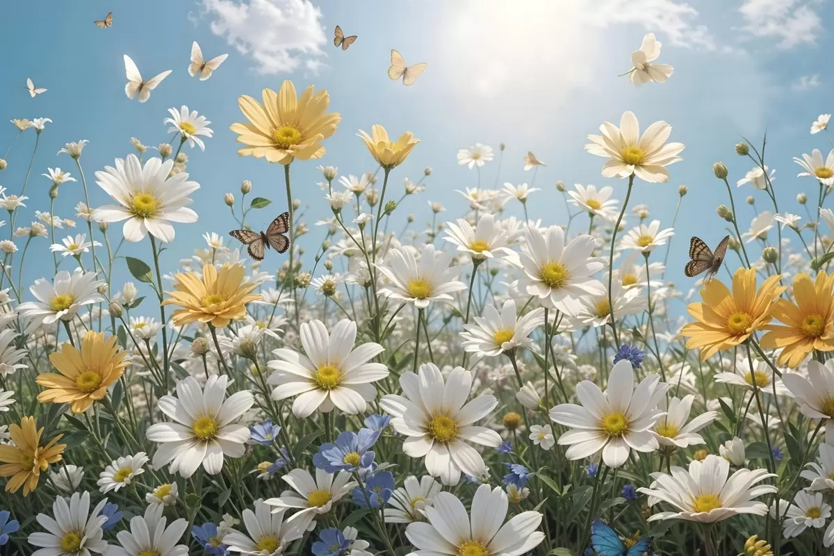 Poster Un campo di margherite bianche e gialle contro un cielo blu con soffici nuvole bianche e farfalle che volano sopra di esse Nr f41726