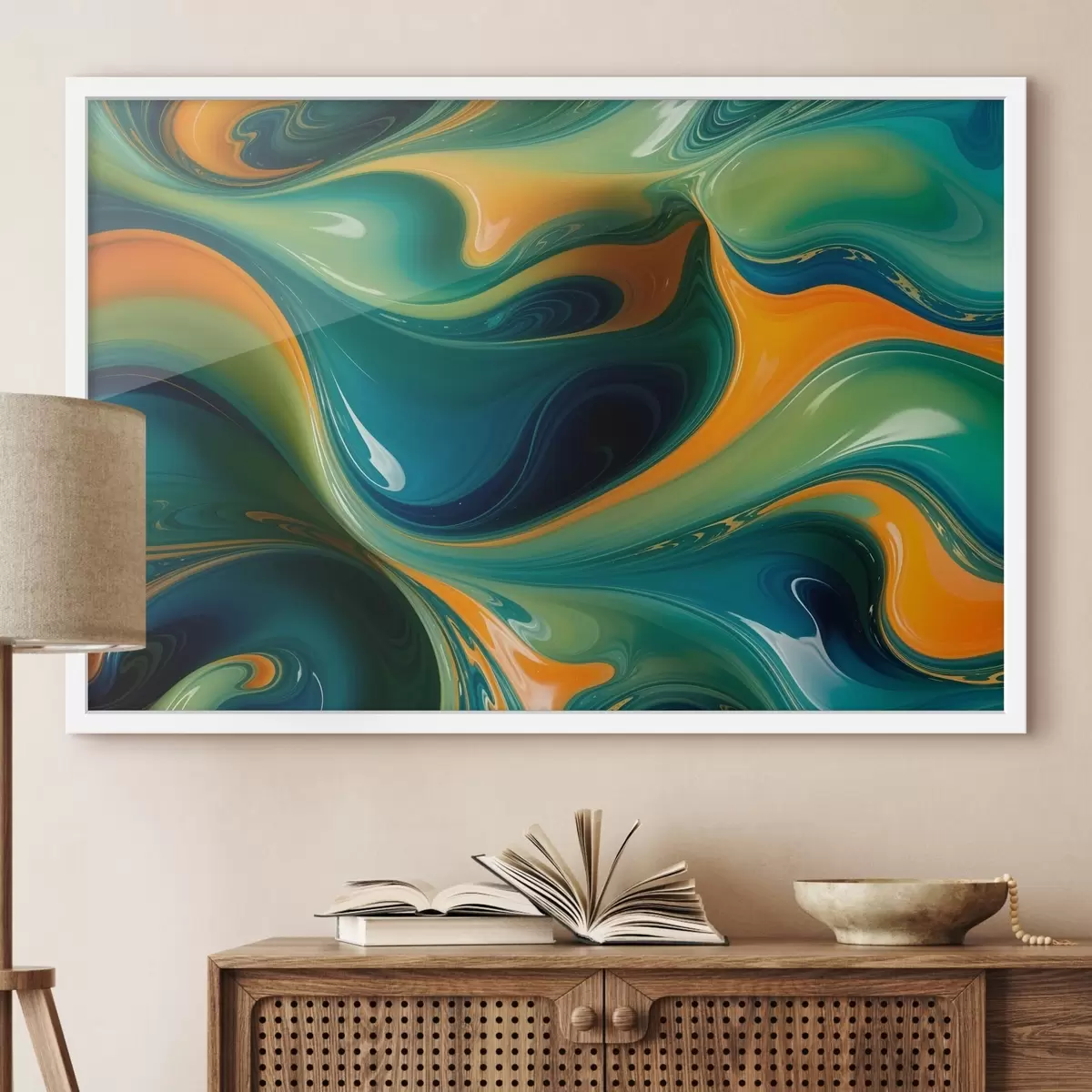 Poster Motivi astratti vorticosi nei toni del verde, del blu e dell'arancione con forme e texture fluide e organiche f41737