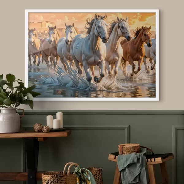 Poster Una mandria di cavalli bianchi che corre nell'acqua bassa, con un cielo arancione sullo sfondo Nr f41740
