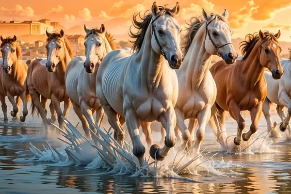Poster Una mandria di cavalli bianchi che corre nell'acqua bassa, con un cielo arancione sullo sfondo Nr f41740