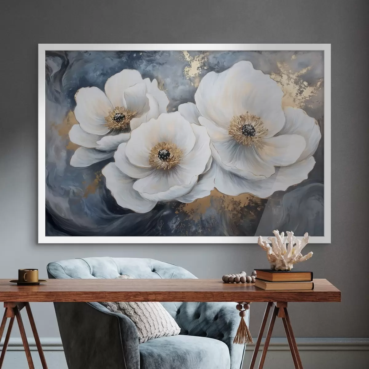 Poster Fiori bianchi e delicati su uno sfondo di pennellate di pittura ad olio f41833