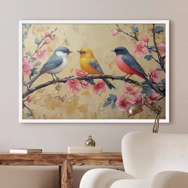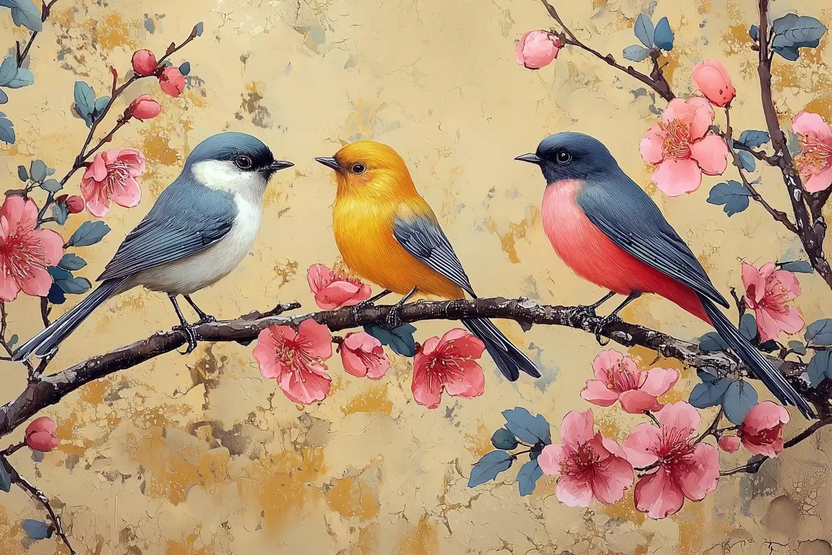 Poster Passeri su un ramo di sakura nello stile della pittura a olio f41835