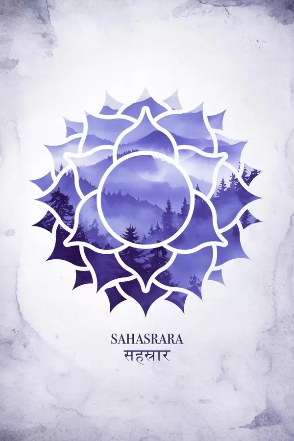 Poster Sahasrara chakra, chakra viola, esoterico, meditazione, buddismo, montagne in stile acquerello f41886