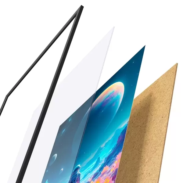 Il poster è composto da cornice, plexiglass, immagine stampata e supporto in truciolato. Il poster può essere immediatamente appeso alla parete grazie ai supporti sul retro.
