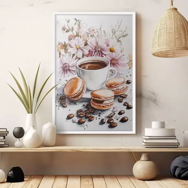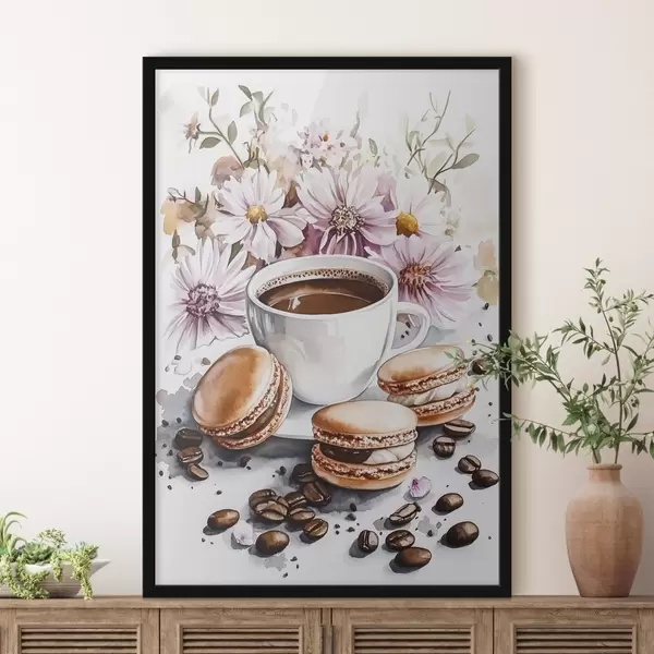 Poster Tazza di caffè con amaretti, fiori rosa, stile acquerello, chicchi di caffè Nr f41963