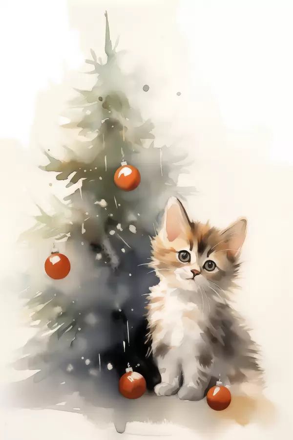 Poster Gattino vicino all'albero di Natale imitazione di acquerello bagnato Nr f42140