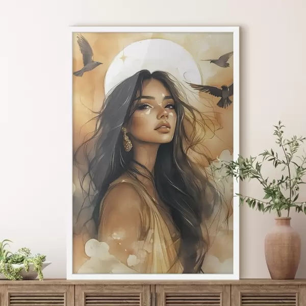 Poster Donna con uccelli in volo, tribale, colori beige, sole f42196