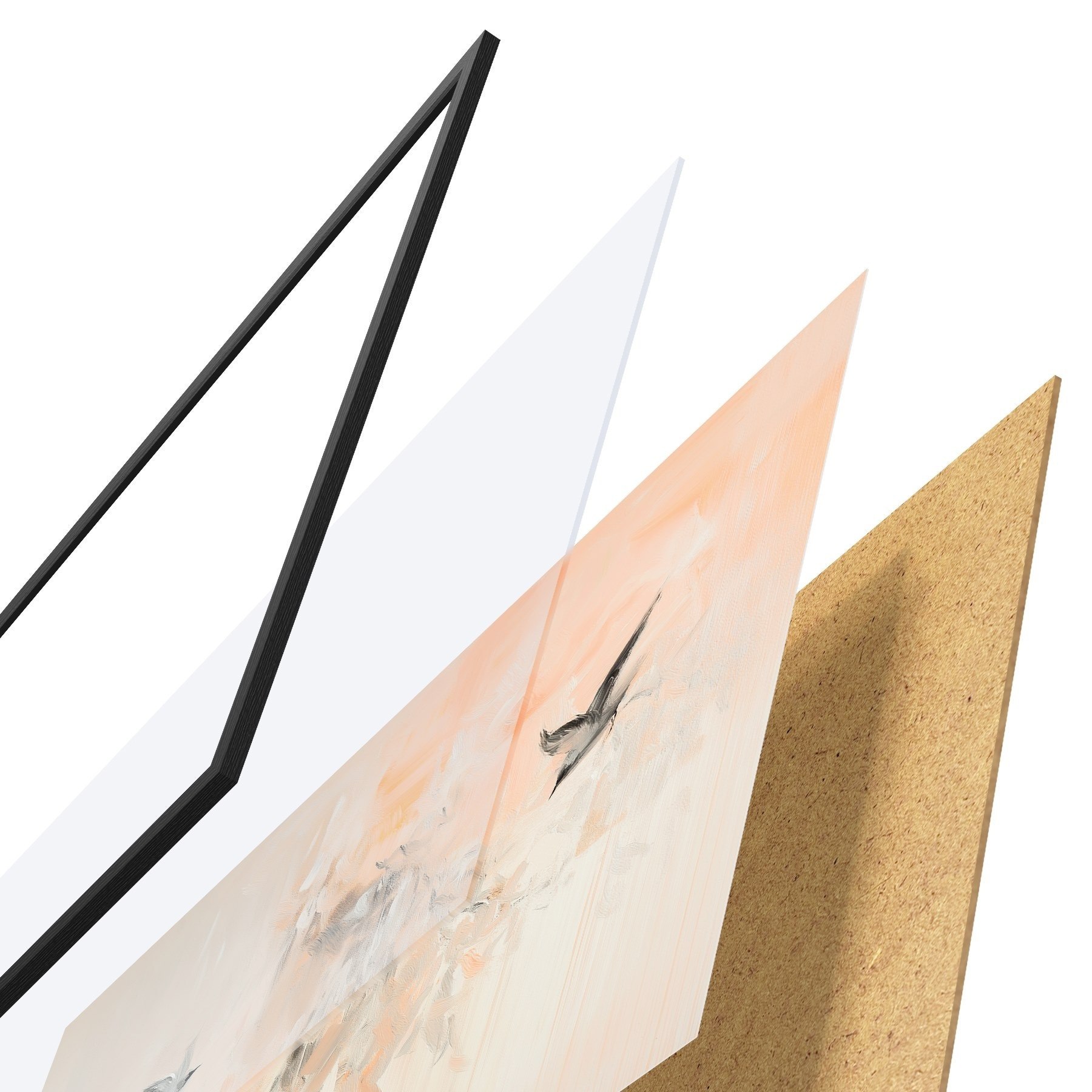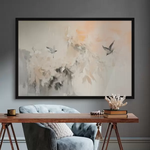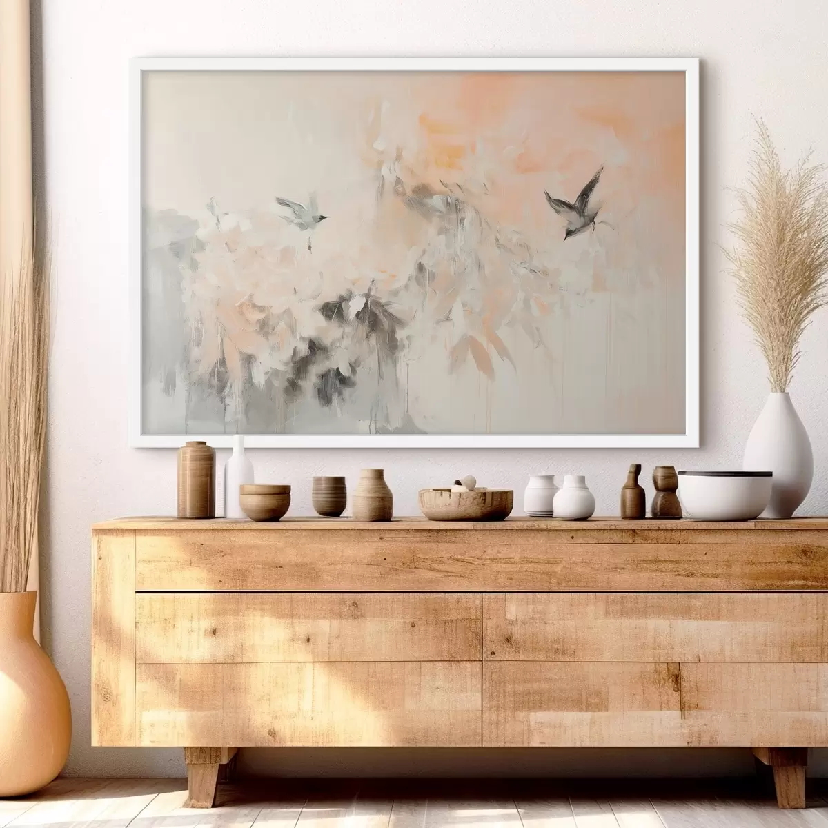 Poster Astrazione con uccelli in volo, stile acrilico, colori rosa e beige Nr f42205