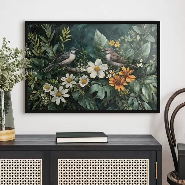 Poster Piccoli uccelli appollaiati sui rami circondati da un rigoglioso fogliame tropicale, con grandi foglie verdi e fiori colorati Nr f42220