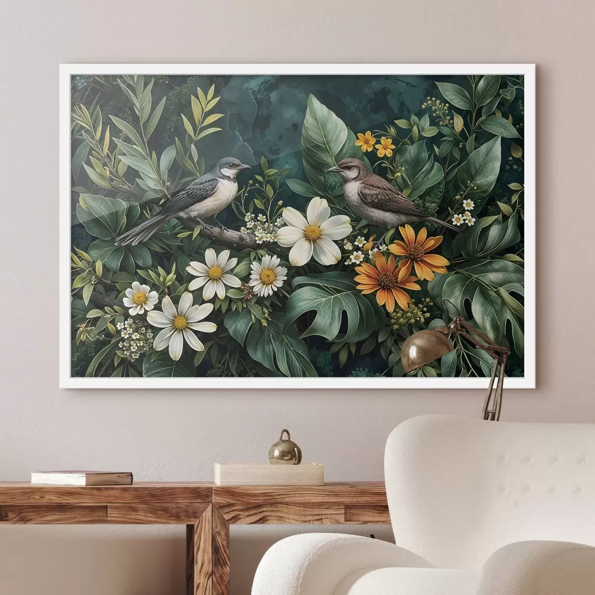 Poster Piccoli uccelli appollaiati sui rami circondati da un rigoglioso fogliame tropicale, con grandi foglie verdi e fiori colorati f42220