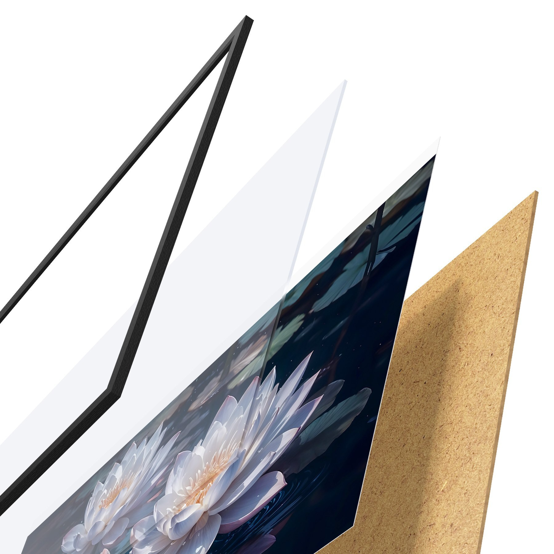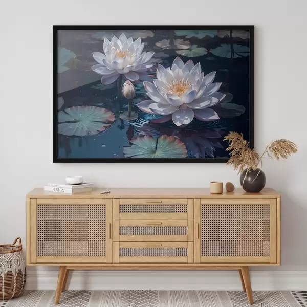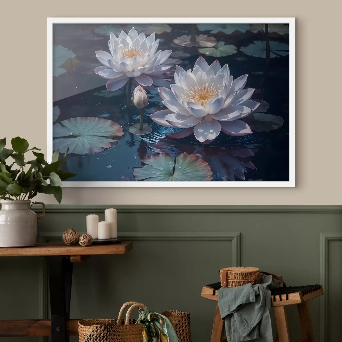 Poster Fiori di loto bianchi che galleggiano su uno stagno tranquillo con ninfee Nr f42225