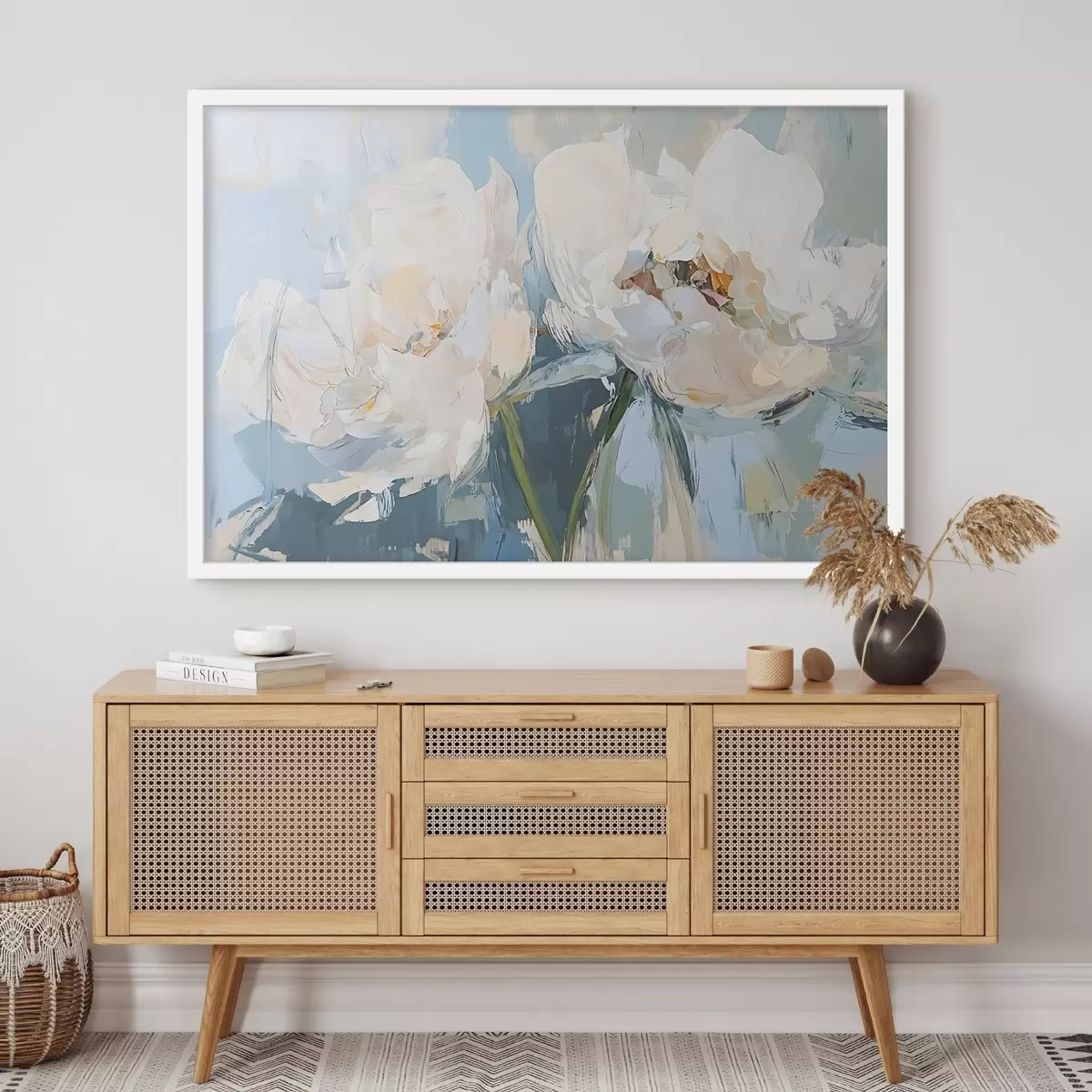 Poster Bianco minimalista astratto peonie pittura ad olio imitazione su uno sfondo blu morbido Nr f42226