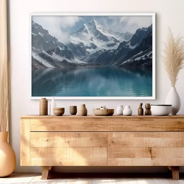 Poster Una vetta innevata che si riflette in un lago sereno e turchese, circondato da un terreno roccioso e da nuvole spettacolari Nr f42232