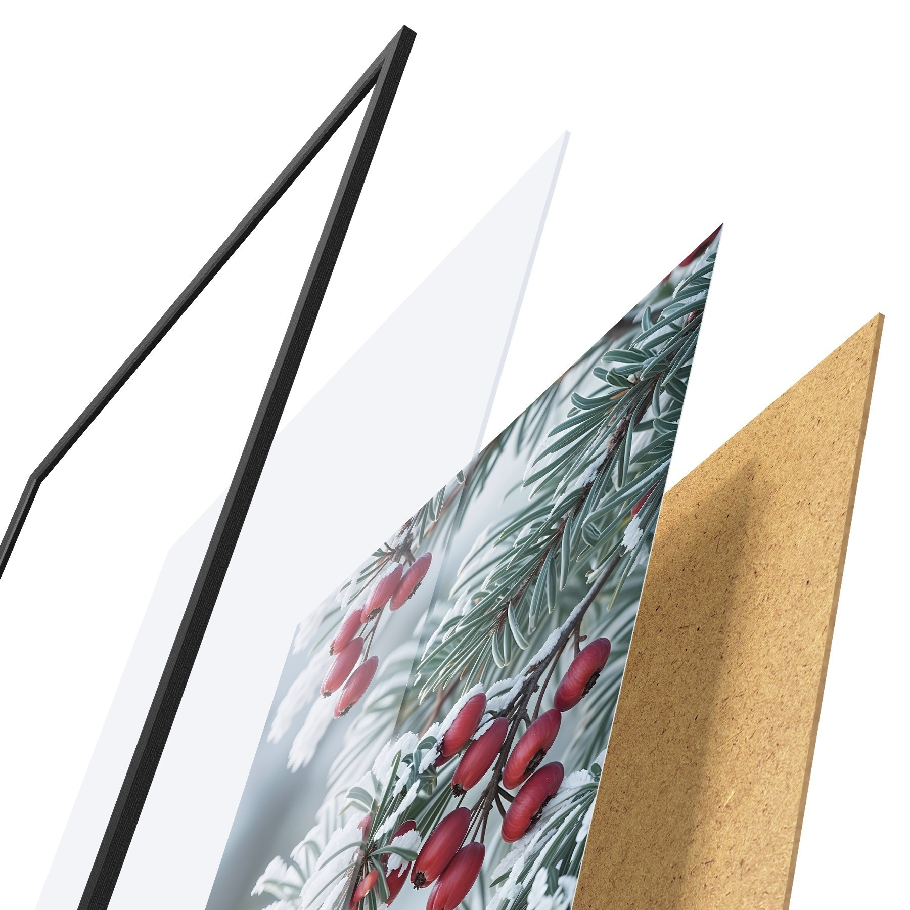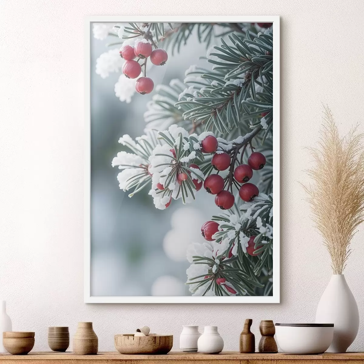 Poster Ramo di pino innevato con bacche rosse , scena invernale Nr f42238