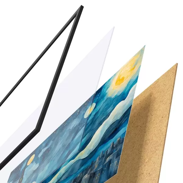 Il poster è composto da cornice, plexiglass, immagine stampata e supporto in truciolato. Il poster può essere immediatamente appeso alla parete grazie ai supporti sul retro.