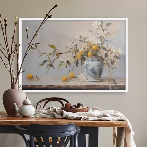 Poster Vaso con rami di fiori bianchi e pittura a imitazione di limone Nr f42360