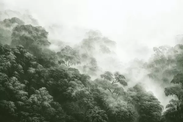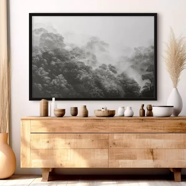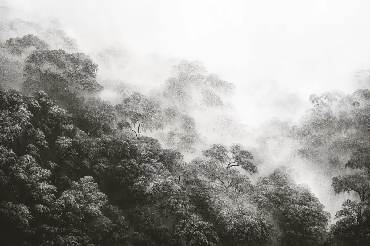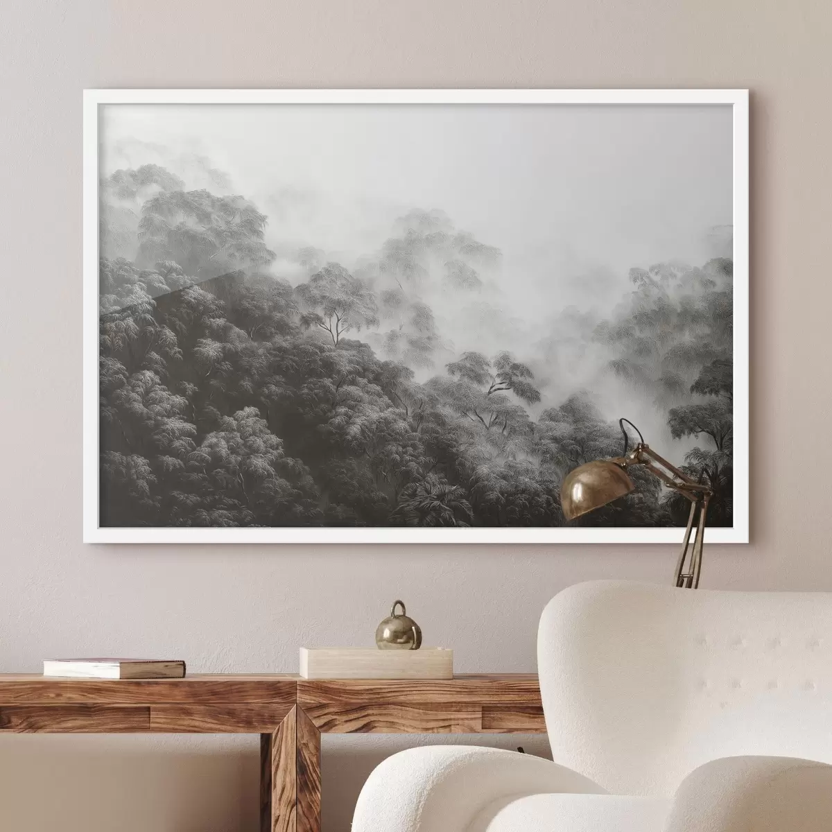 Poster Foresta tropicale nella nebbia, palme, colori grigi Nr f42371v1