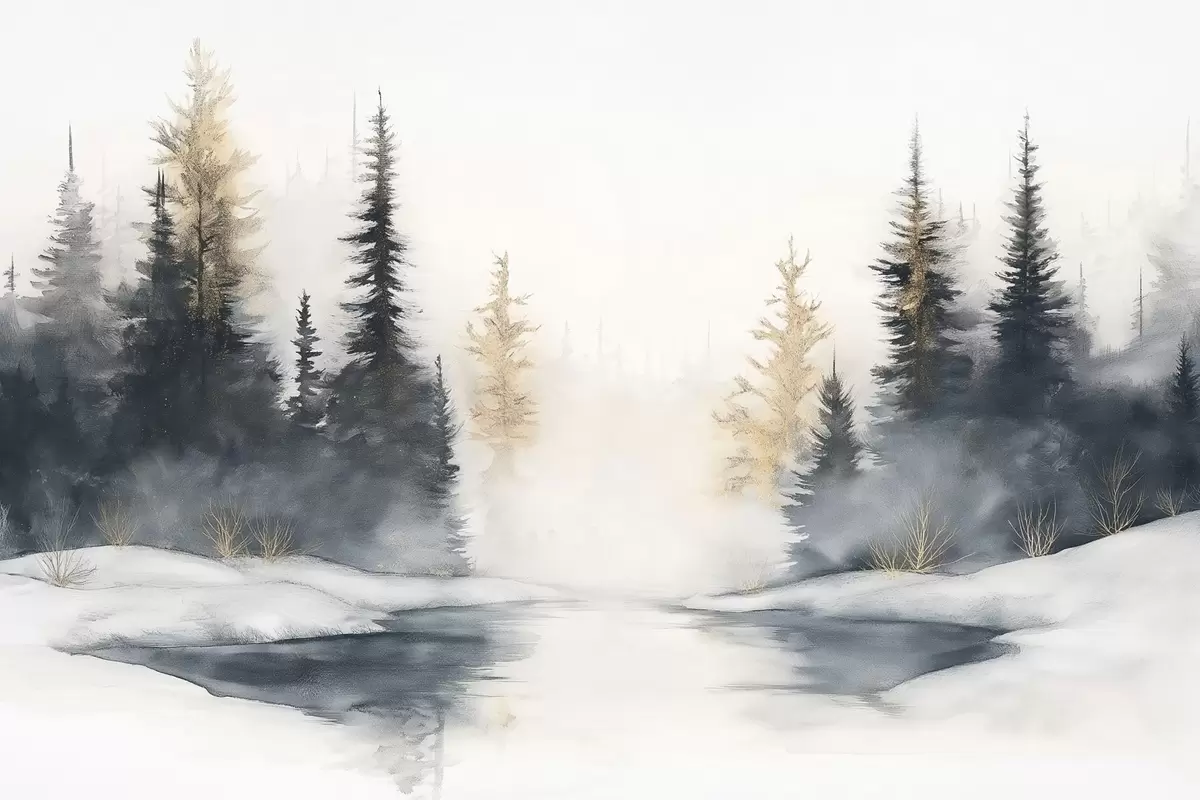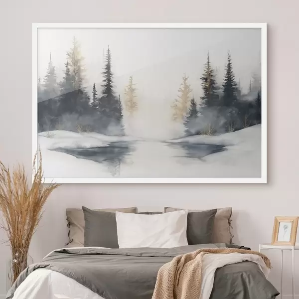 Poster Paesaggio invernale con fiume e pini, natura, foresta, nebbia Nr f42374