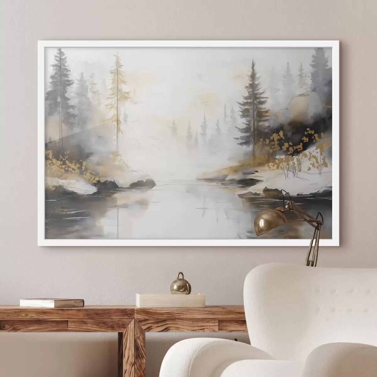Poster Paesaggio naturale con fiume, foresta e pini, colori pastello tenui Nr f42375