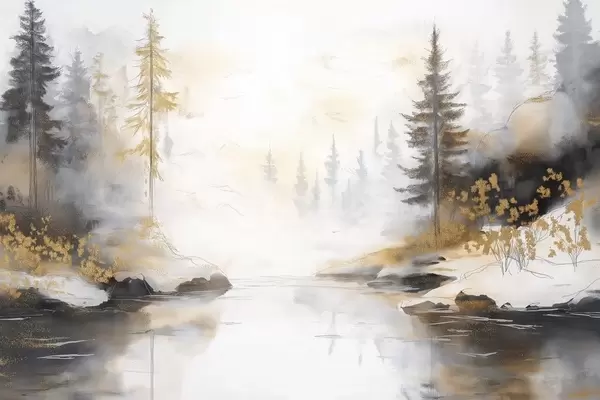 Poster Paesaggio naturale con fiume, foresta e pini, colori pastello tenui Nr f42375