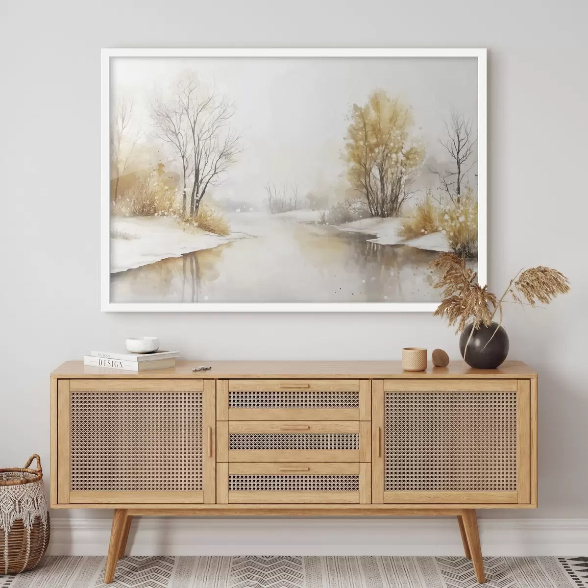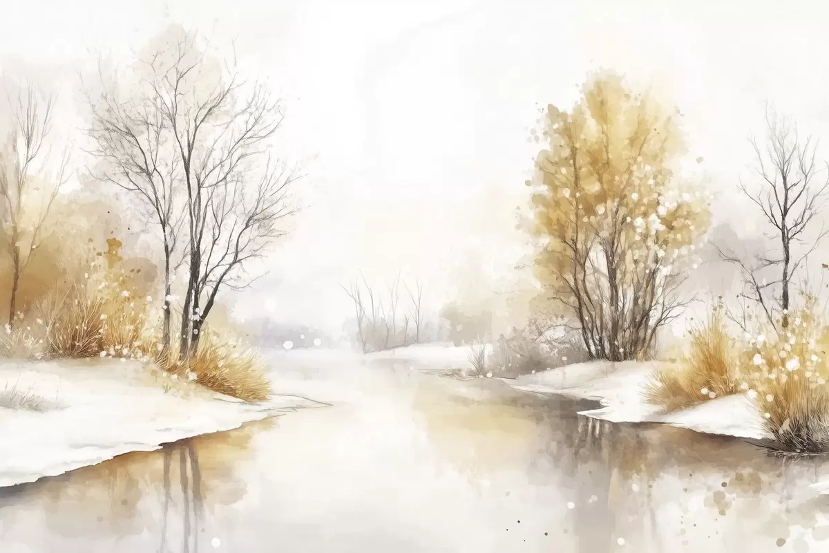 Poster Paesaggio invernale, fiume e alberi, stile acquerello, colori beige Nr f42376