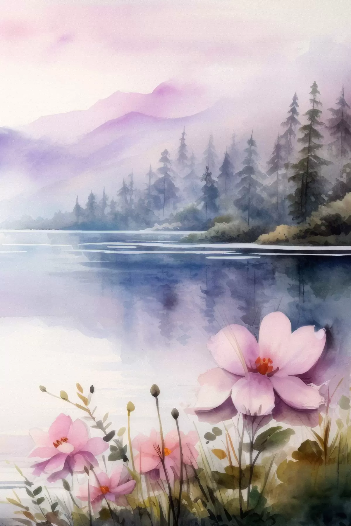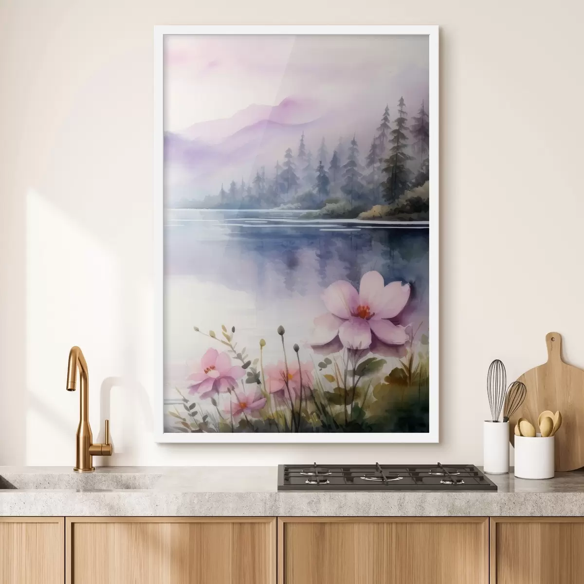 Poster Fiori rosa sullo sfondo di un lago in montagna Nr f42393