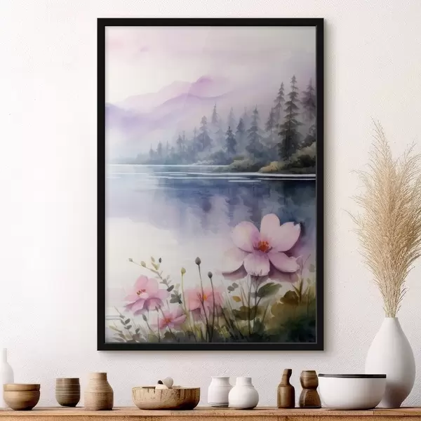 Poster Fiori rosa sullo sfondo di un lago in montagna f42393