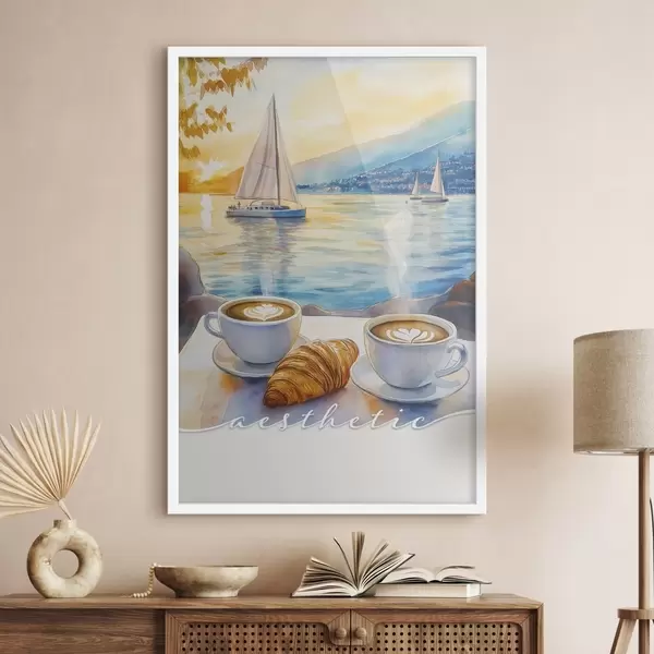 Poster Due tazze di cappuccino, stile acquerello, tramonto in mare, barche a vela, vocazione Nr f42438