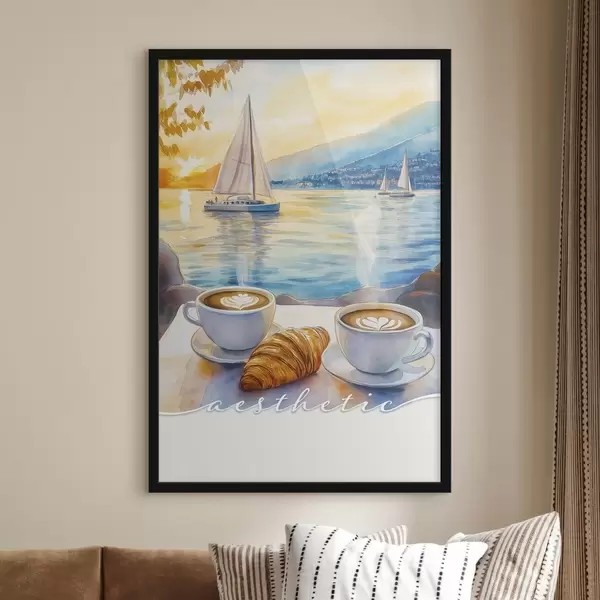 Poster Due tazze di cappuccino, stile acquerello, tramonto in mare, barche a vela, vocazione f42438