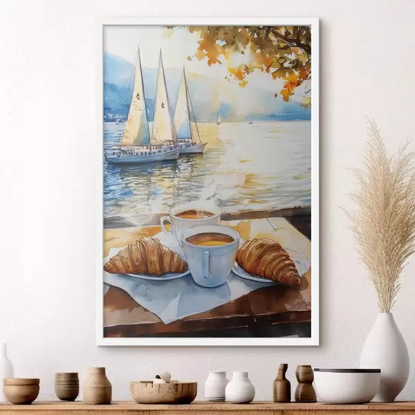 Poster Tazze di caffè, colori del tramonto, lago, barche a vela, natura, viaggi Nr f42443