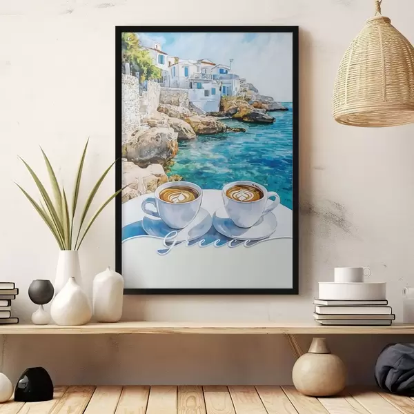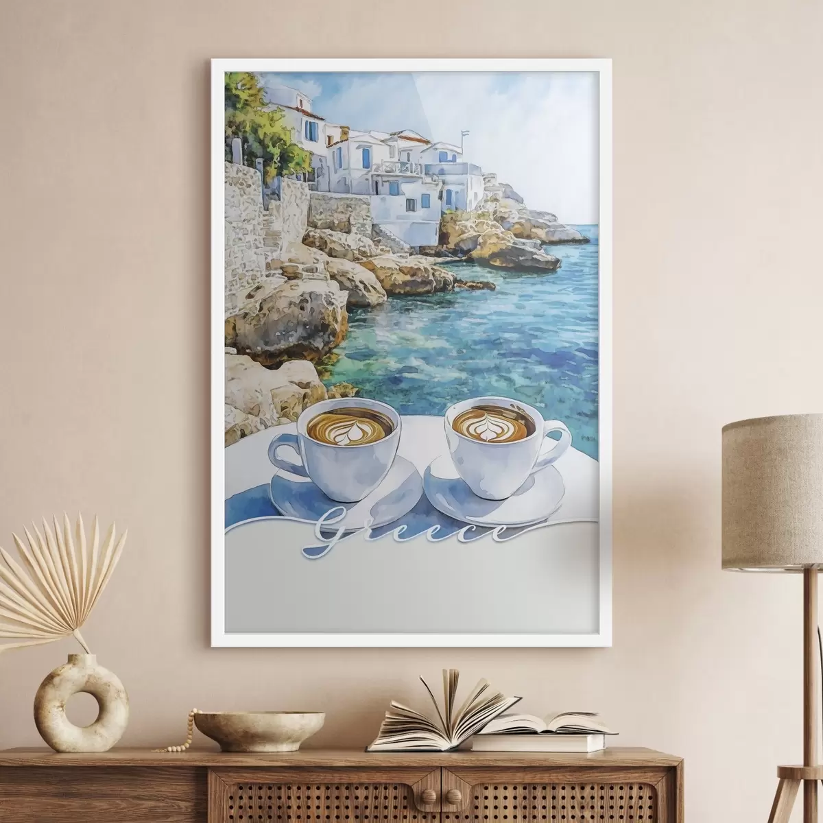 Poster Grecia estetica, tazze di caffè, mare blu, città vecchia, viaggio Nr f42447