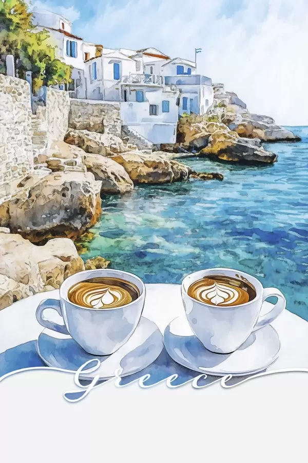 Poster Grecia estetica, tazze di caffè, mare blu, città vecchia, viaggio Nr f42447