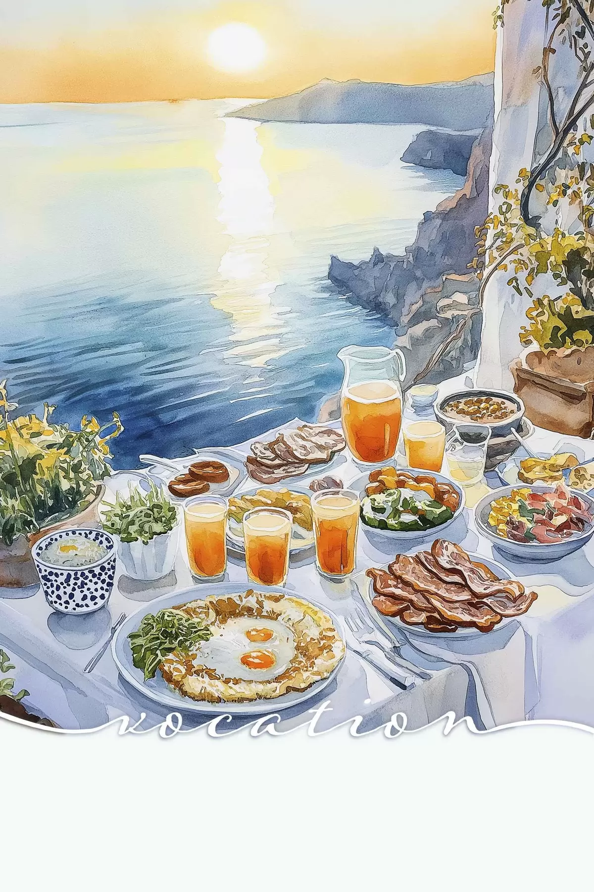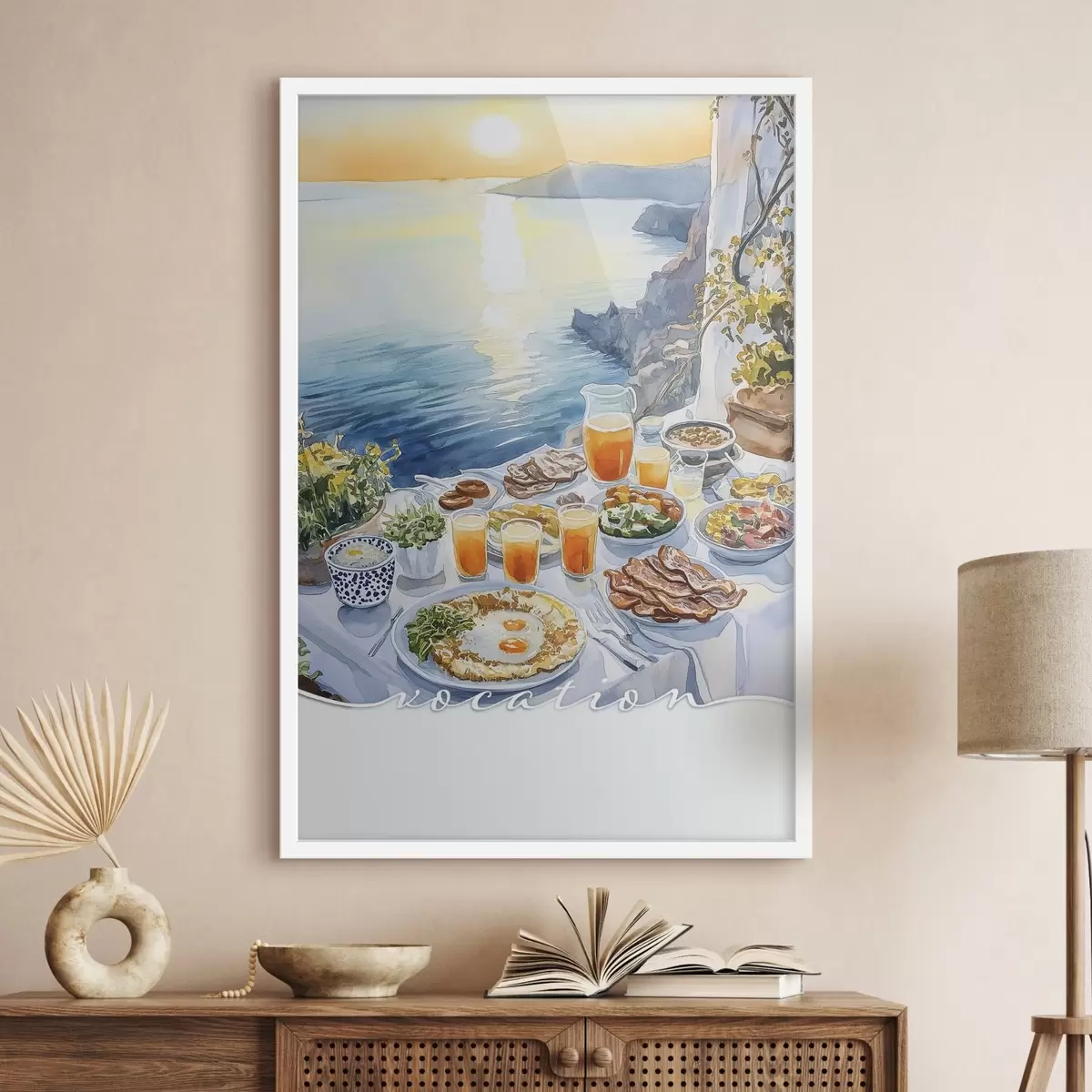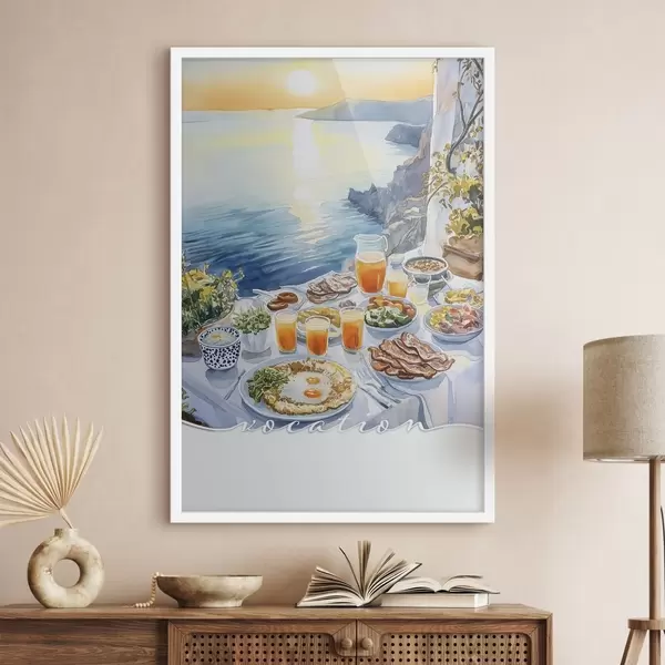 Poster Vocazione romantica in Grecia, stile acquerello, colazione, alba f42453