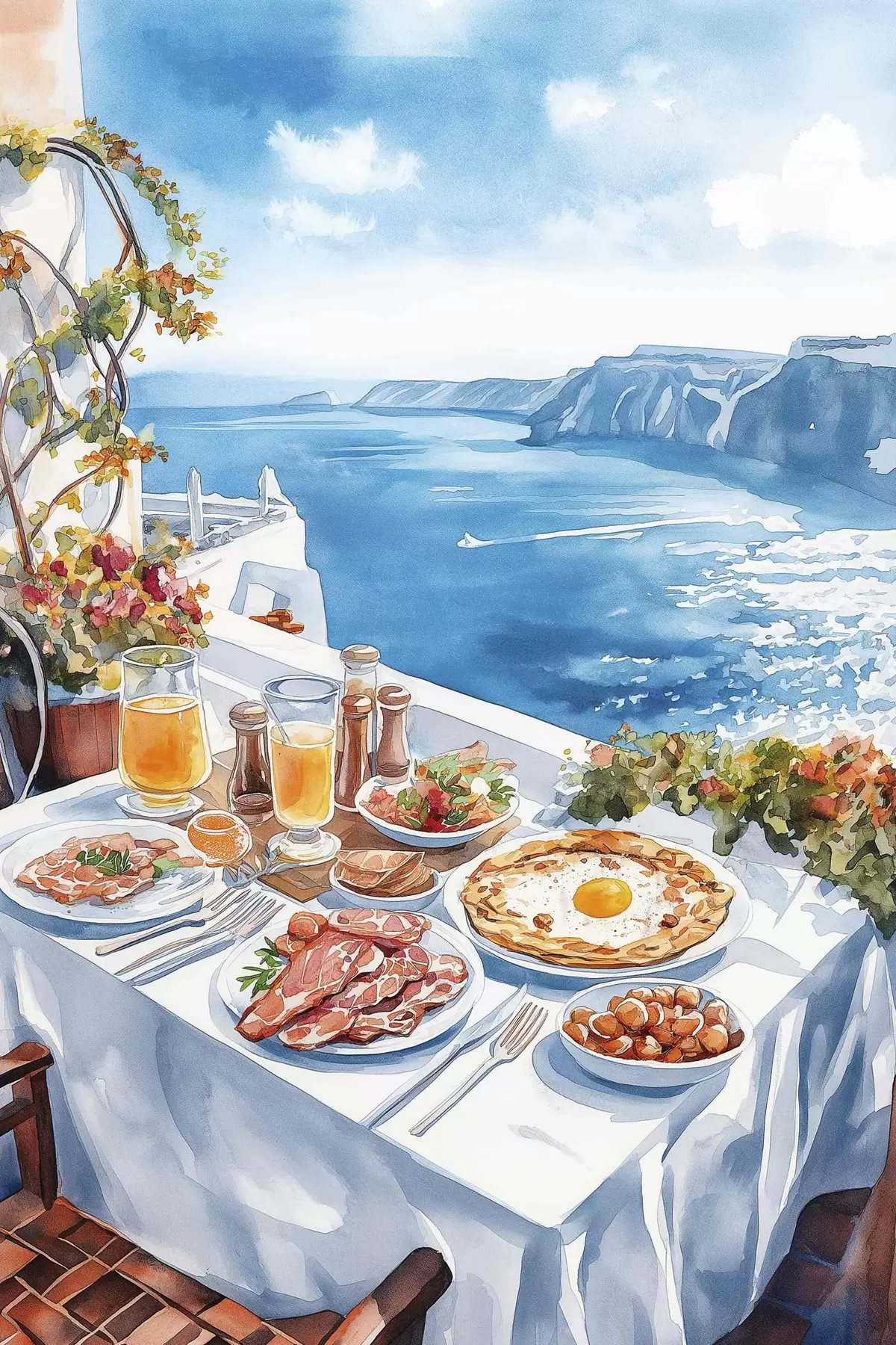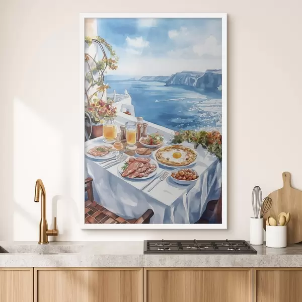Poster Bella colazione romantica in Grecia, mare, stile acquerello Nr f42455
