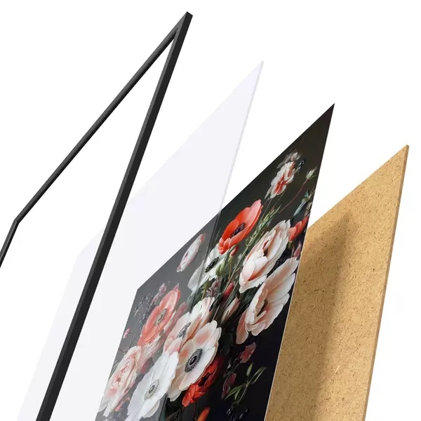 Il poster è composto da cornice, plexiglass, immagine stampata e supporto in truciolato. Il poster può essere immediatamente appeso alla parete grazie ai supporti sul retro.
