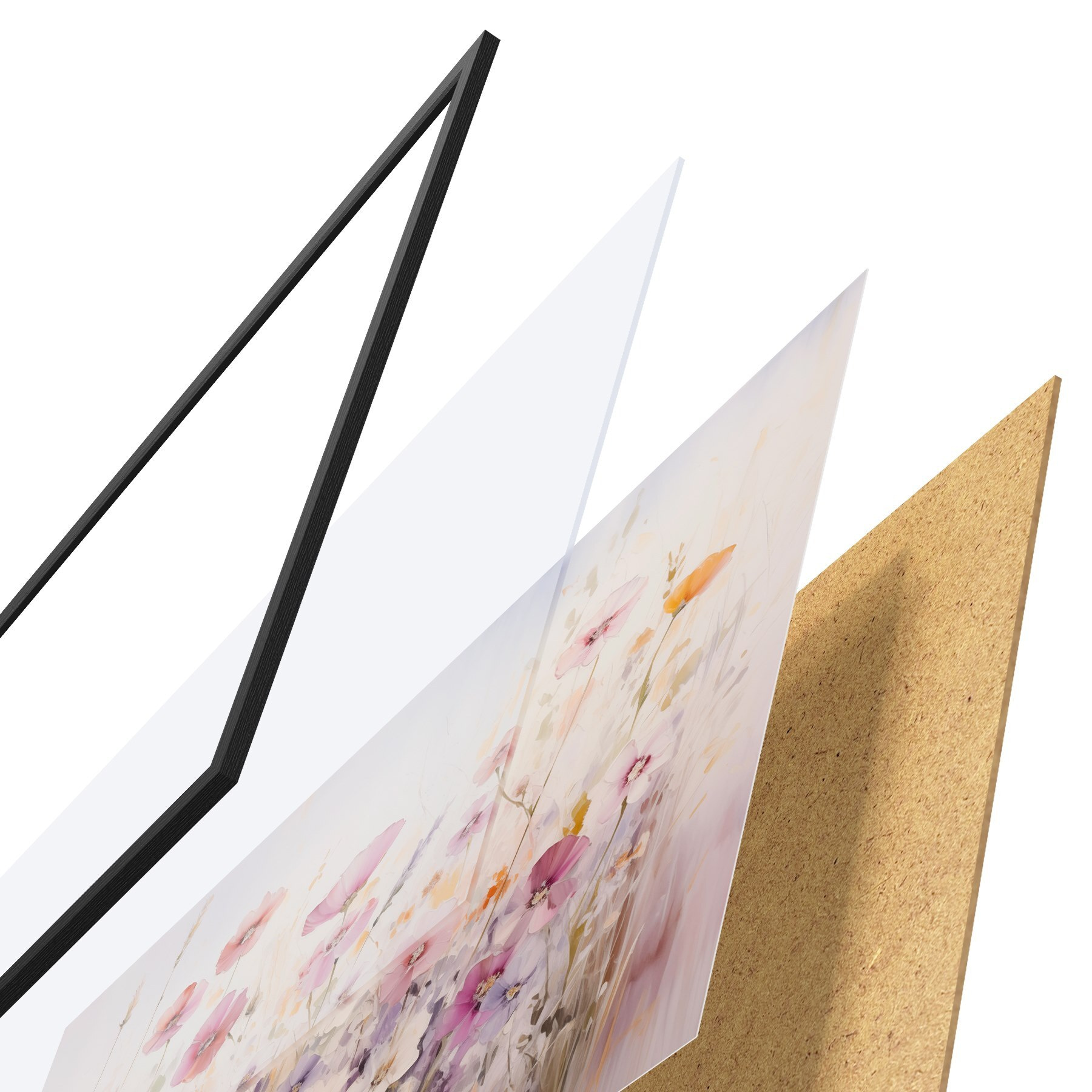 Poster Un prato con fiori acquerellati in delicate tonalità rosa, viola e bianche, che creano un'atmosfera di leggerezza e armonia. f42557