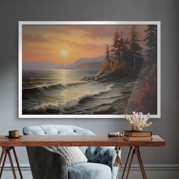 Poster Tramonto sul mare con onde, pineta e colori autunnali in primo piano. f42571