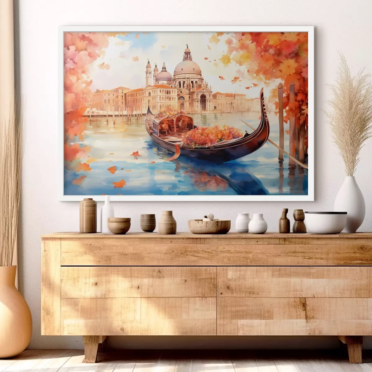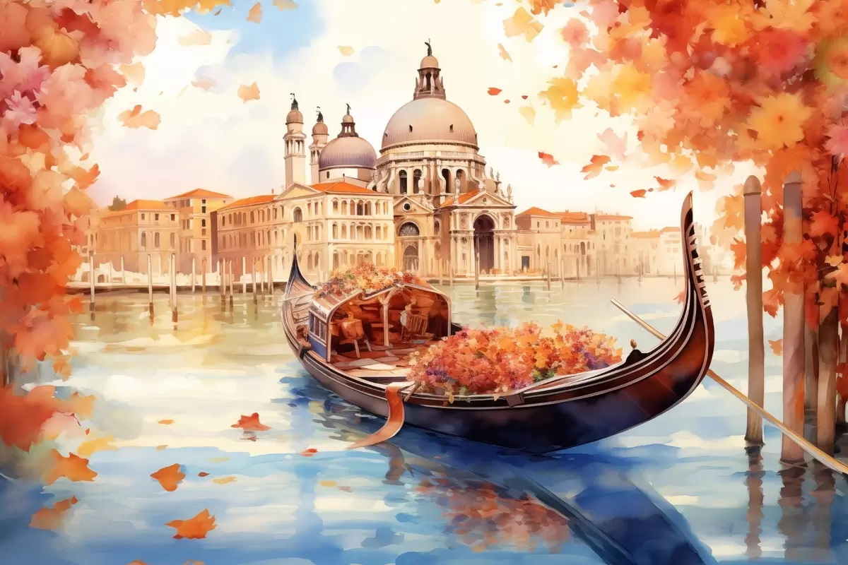 Poster Una veduta autunnale di Venezia con una gondola circondata da foglie arancioni e rosse, con i riflessi degli edifici nell'acqua calma del canale. Nr f42576