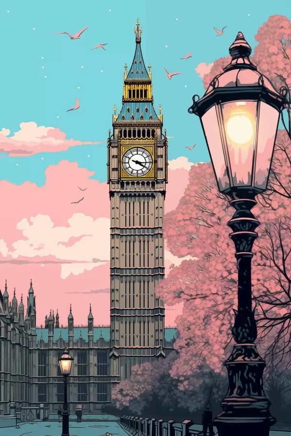 Poster Una vista del Big Ben con alberi rosa primaverili, un cielo blu brillante e un lampione vintage in primo piano. f42578