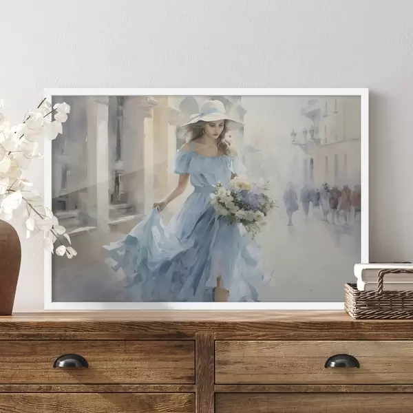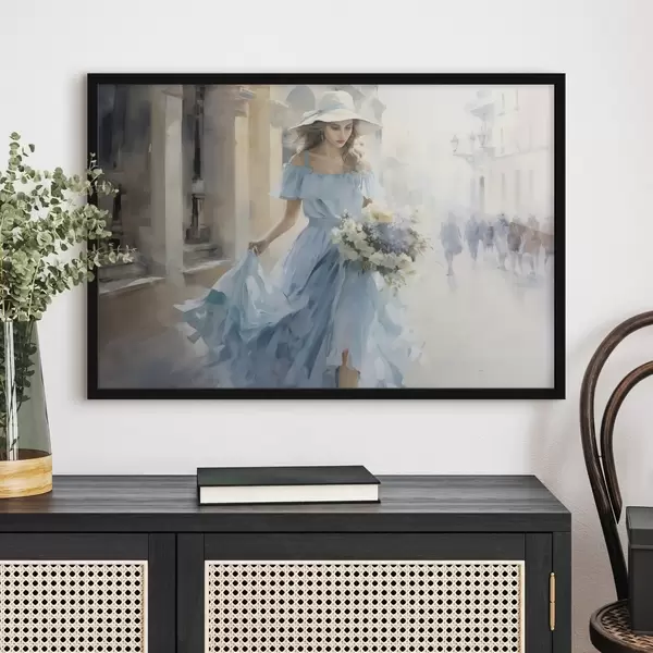 Poster Un'elegante ragazza in abito azzurro e cappello passeggia per la città, tenendo in mano un bouquet di fiori, in uno stato d'animo leggero e romantico. Nr f42580