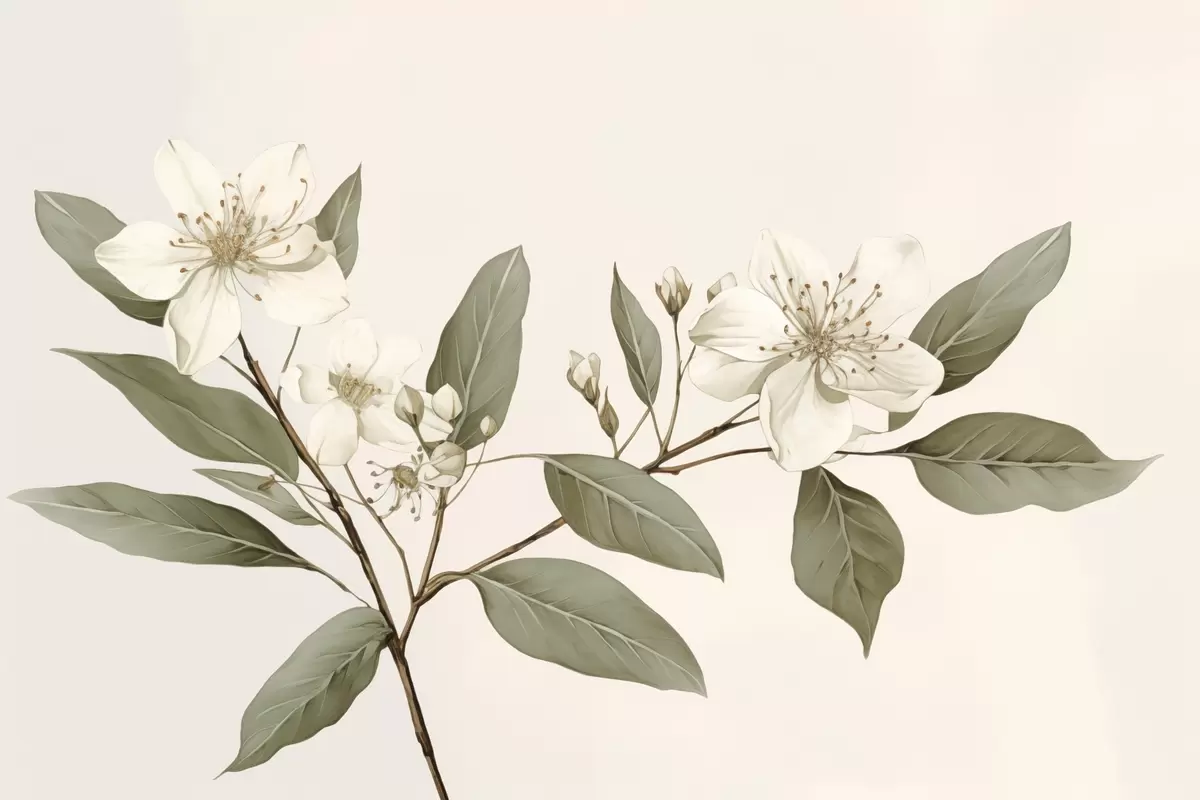 Poster Un ramo delicato con fiori bianchi e foglie verdi su uno sfondo chiaro, con dettagli morbidi e uno stile elegante. f42583