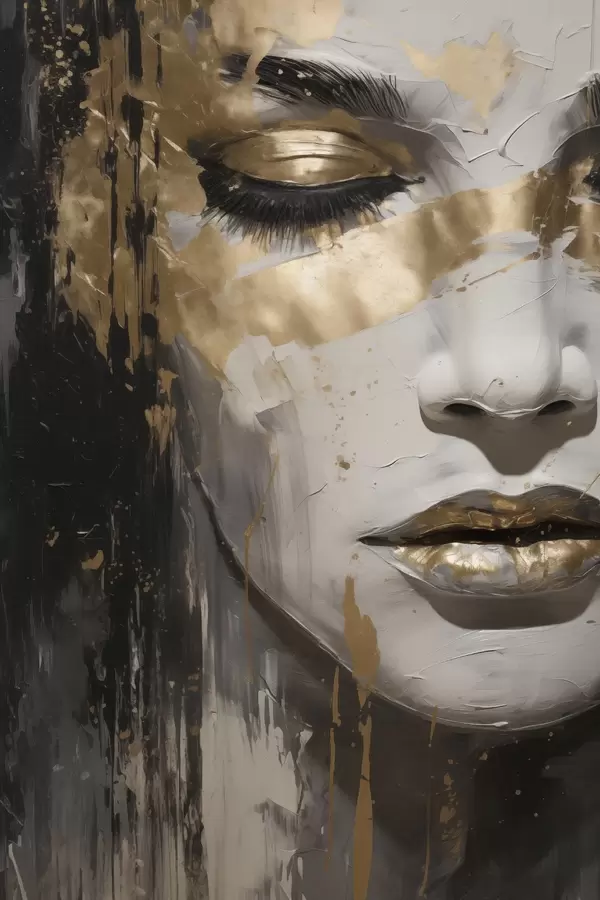 Poster Un ritratto astratto di donna che mette in risalto gli occhi e le labbra chiuse, eseguito in bianco e nero con pennellate dinamiche dai colori caldi. Nr f42626