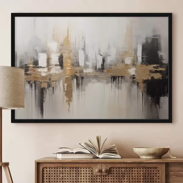 Poster Un paesaggio urbano astratto con riflessi di edifici nell'acqua, creato in toni neutri con accenti di tonalità calde. Nr f42628