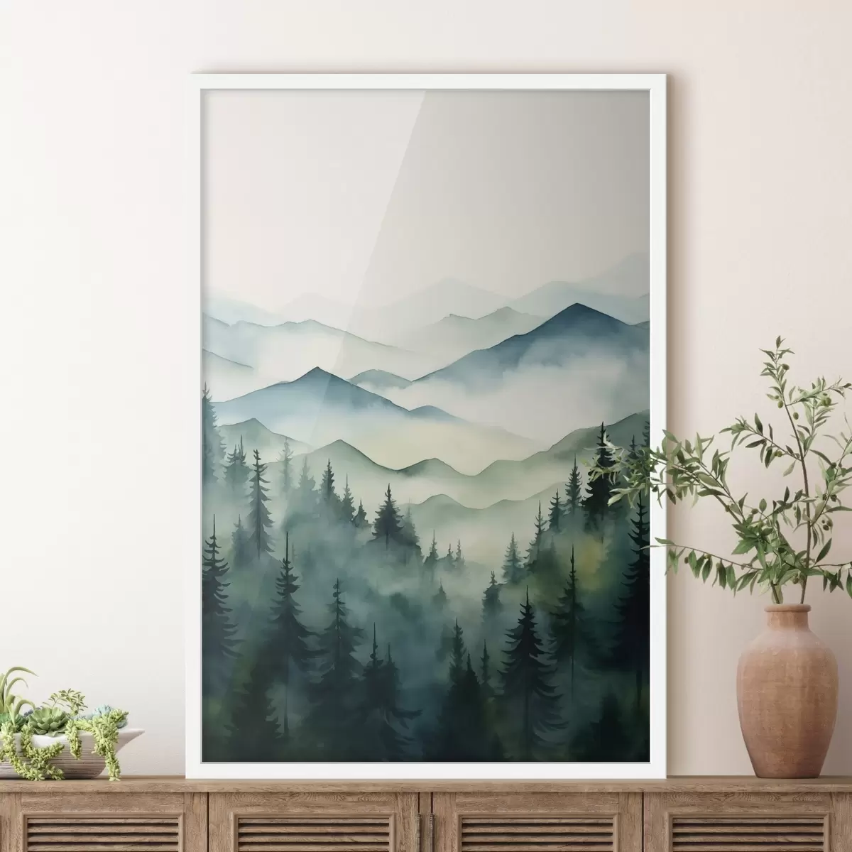 Poster Paesaggio nebbioso con montagne e foreste Nr f42662