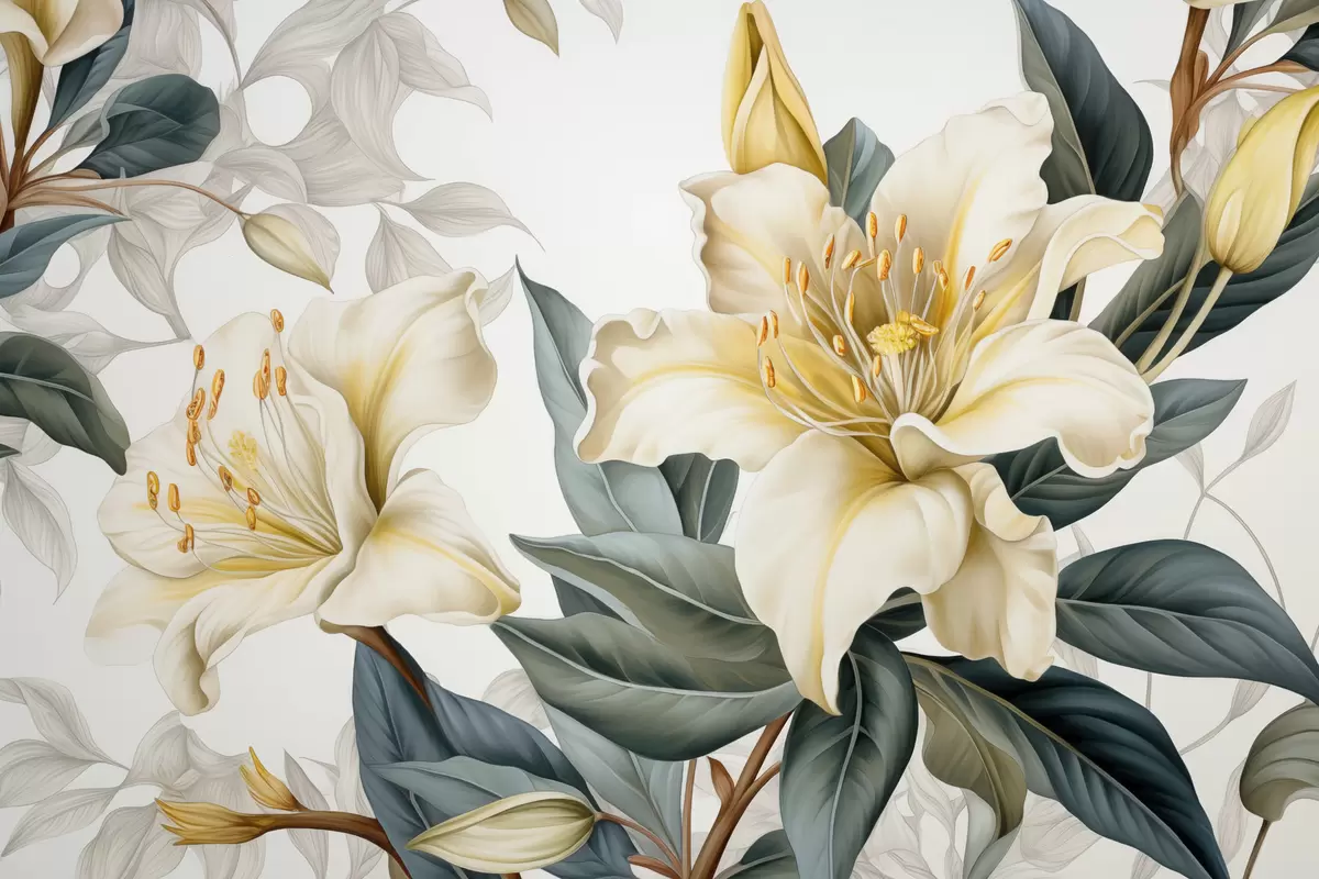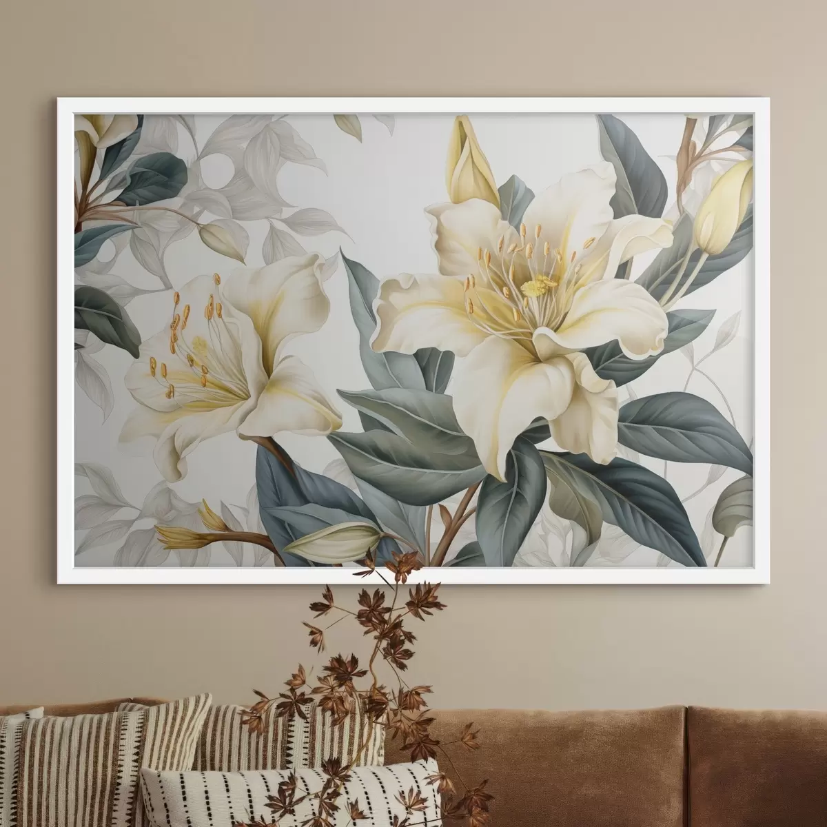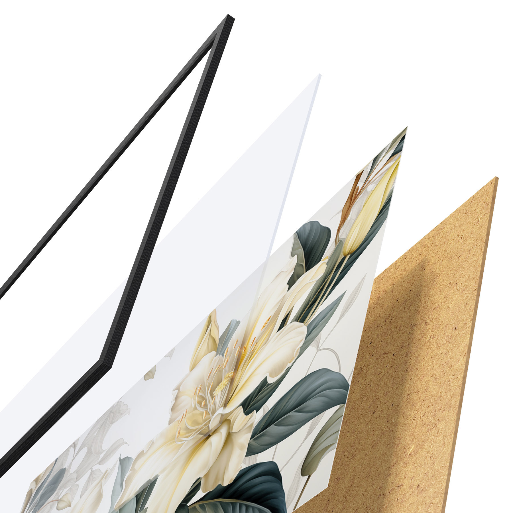 Poster Illustrazione botanica di fiori bianchi e giallo pallido con petali intricati, circondati da foglie verdi f42712