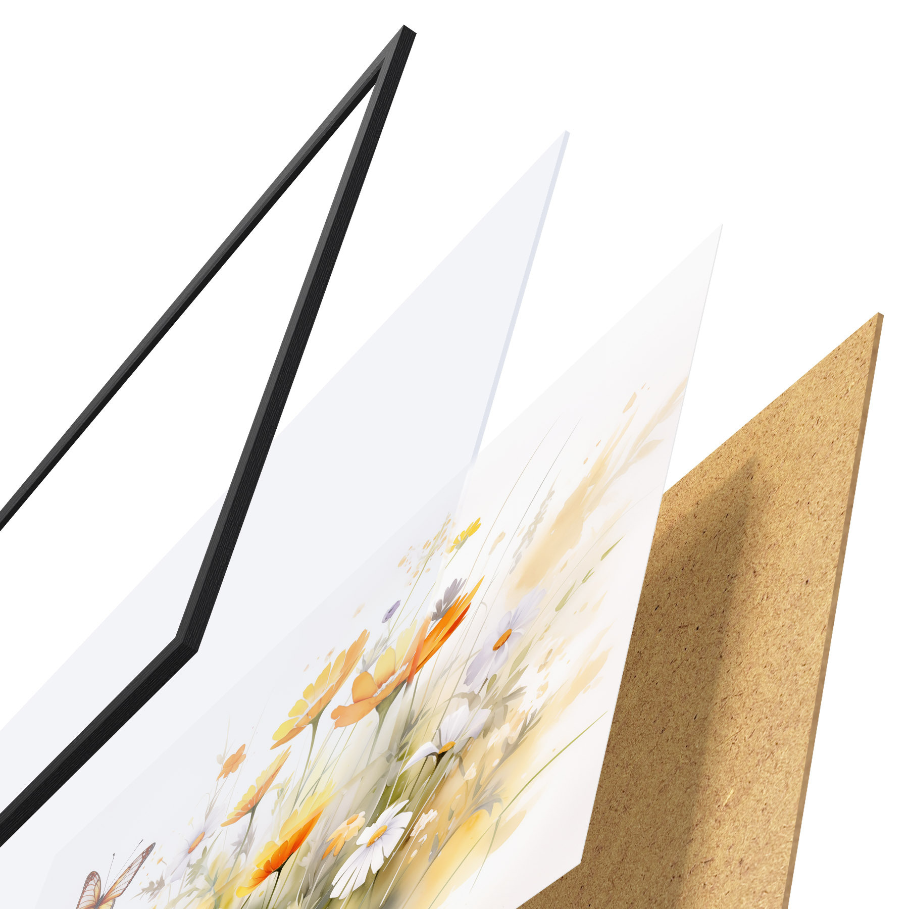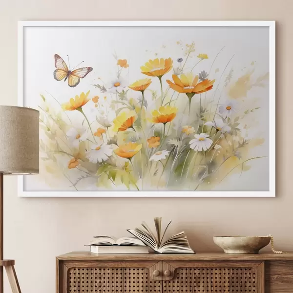 Poster Un vivace campo di fiori ad acquerello con margherite bianche e arancioni e una farfalla che svolazza nelle vicinanze Nr f42714