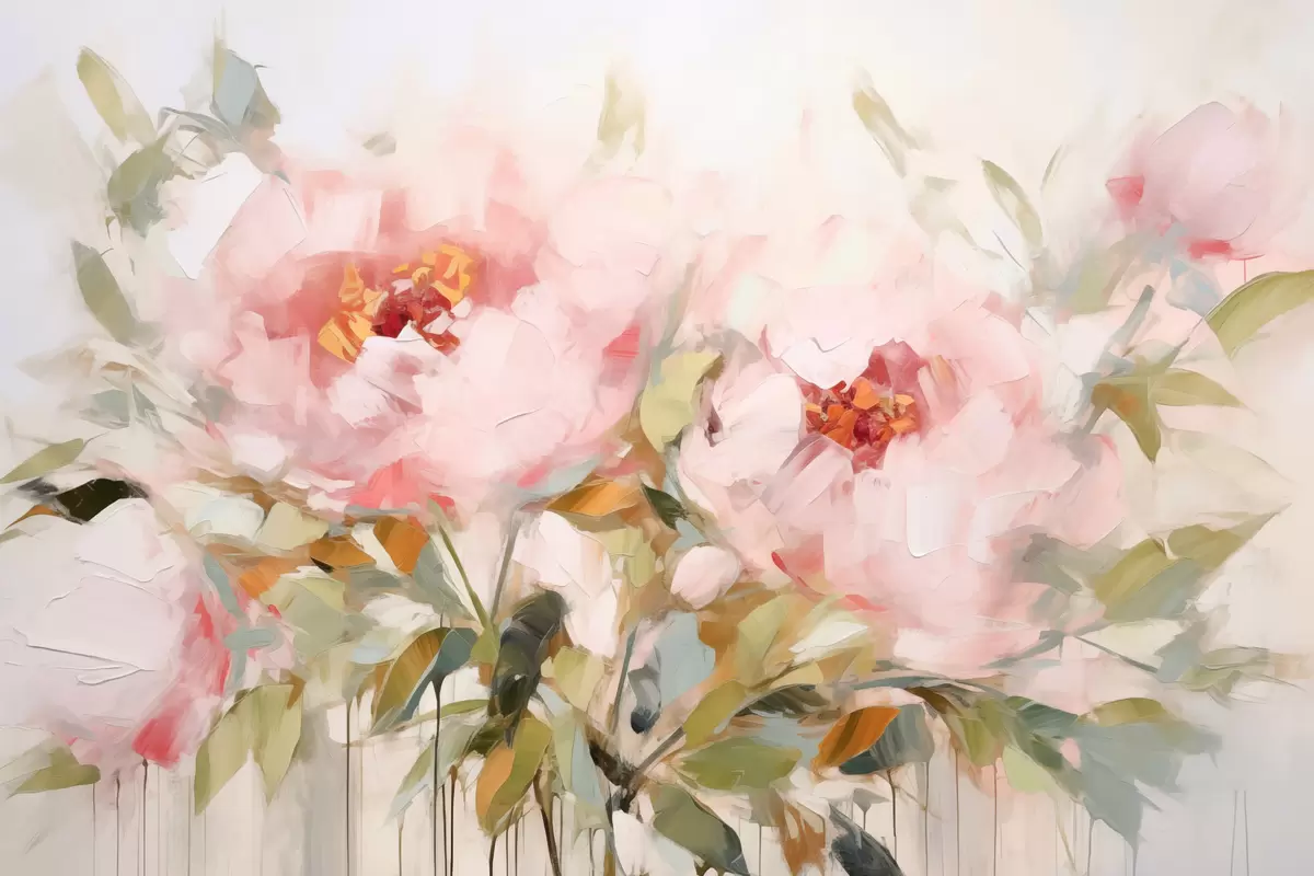 Poster Dipinto a olio che imita grandi peonie rosa con petali morbidi e centri gialli, circondate da foglie verdi Nr f42720