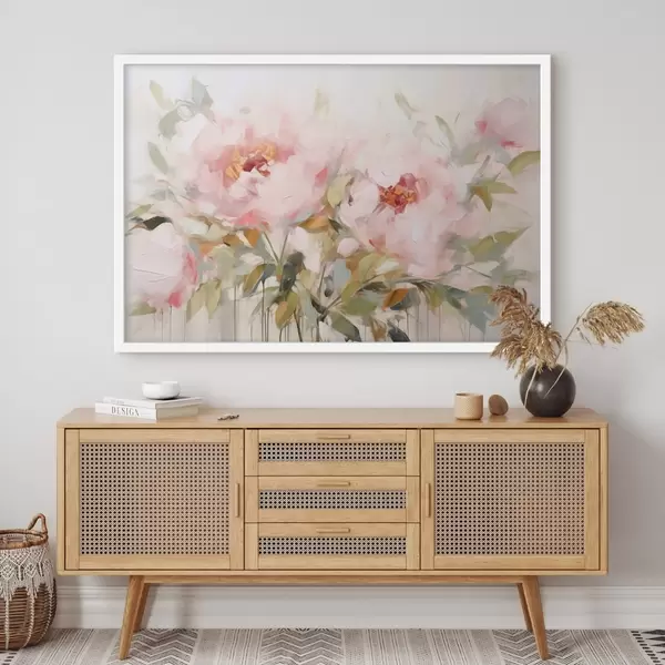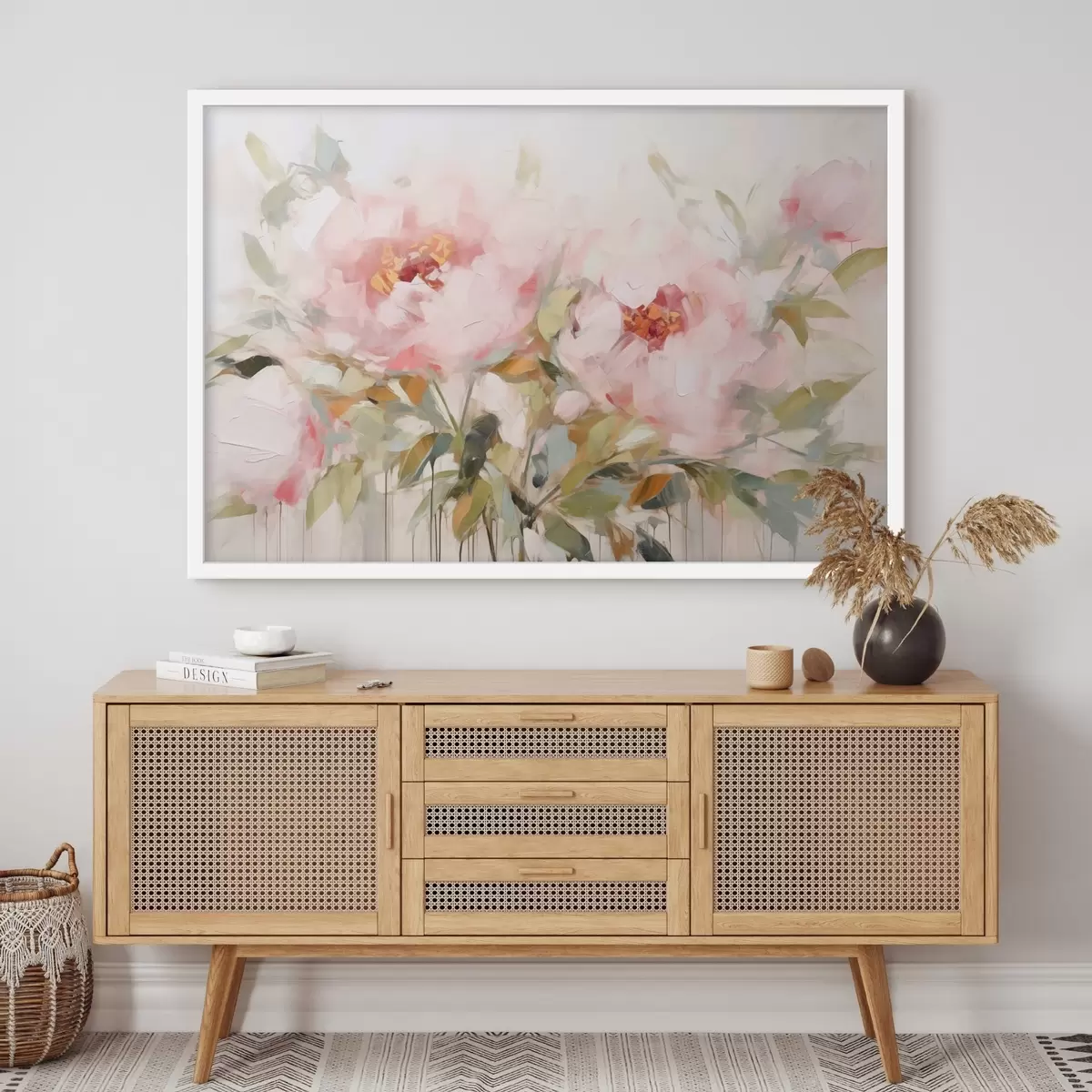 Poster Dipinto a olio che imita grandi peonie rosa con petali morbidi e centri gialli, circondate da foglie verdi f42720