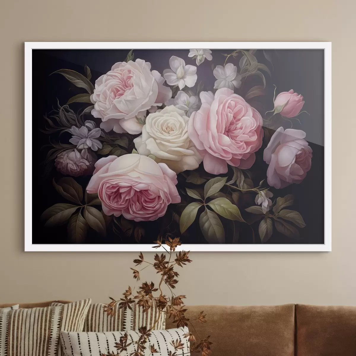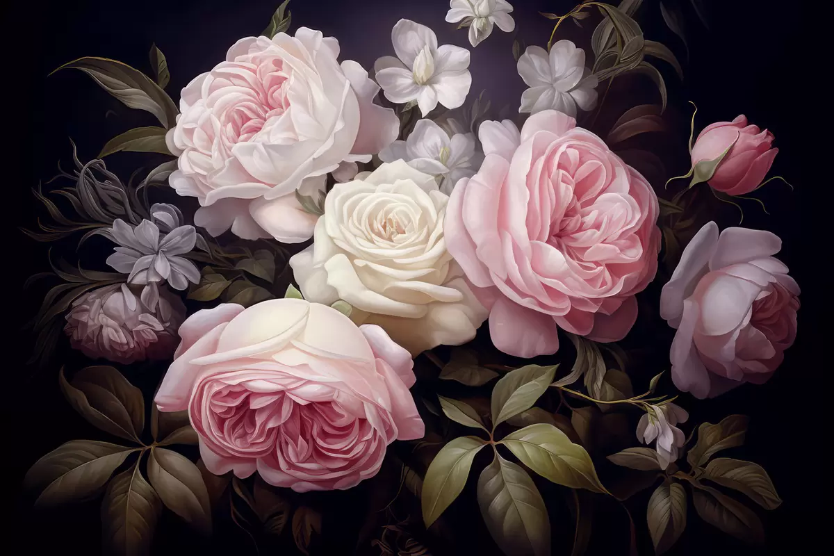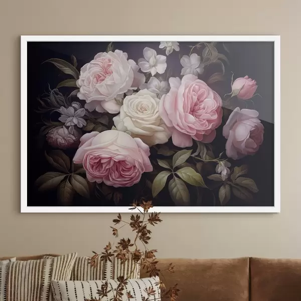 Poster Rose rosa e bianche disposte con delicati fiori bianchi e foglie verdi su uno sfondo scuro Nr f42721