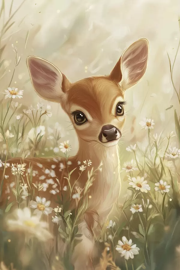 Poster Carino il cervo nel prato con fiori di margherita, disegno a olio Nr f42780